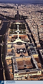 durch städtebebauliche Anlagen und Prestigebauwerke allmählich bis zur Défense hin verlängert: der Triumphbogen des Carrousel, die Tuileriengärten, der Place de la Concorde, der Place de l'Etoile, und dann, im Jahre